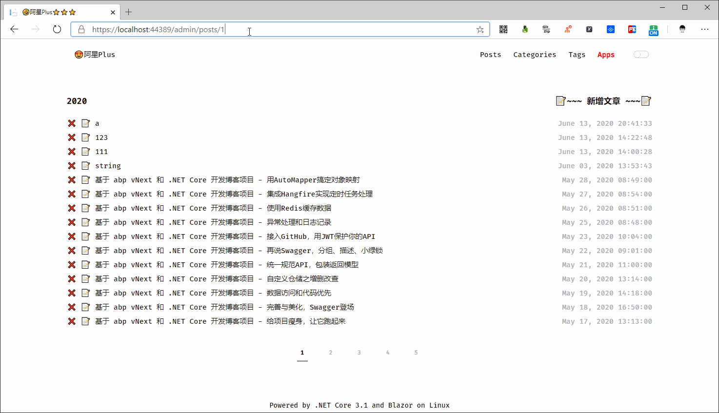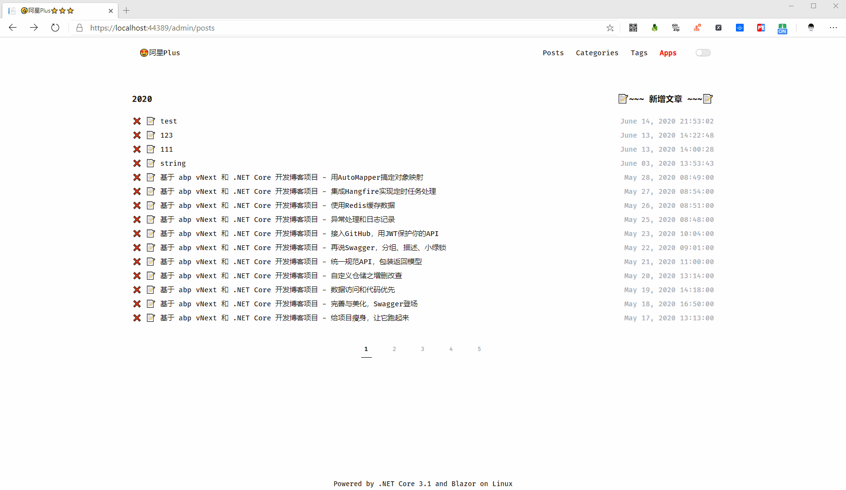 在页面上循环遍历文章数据和翻页页码,每篇文章标题前面添加两个按钮删除和编辑,同时单独加了一个新增文章的按钮。
