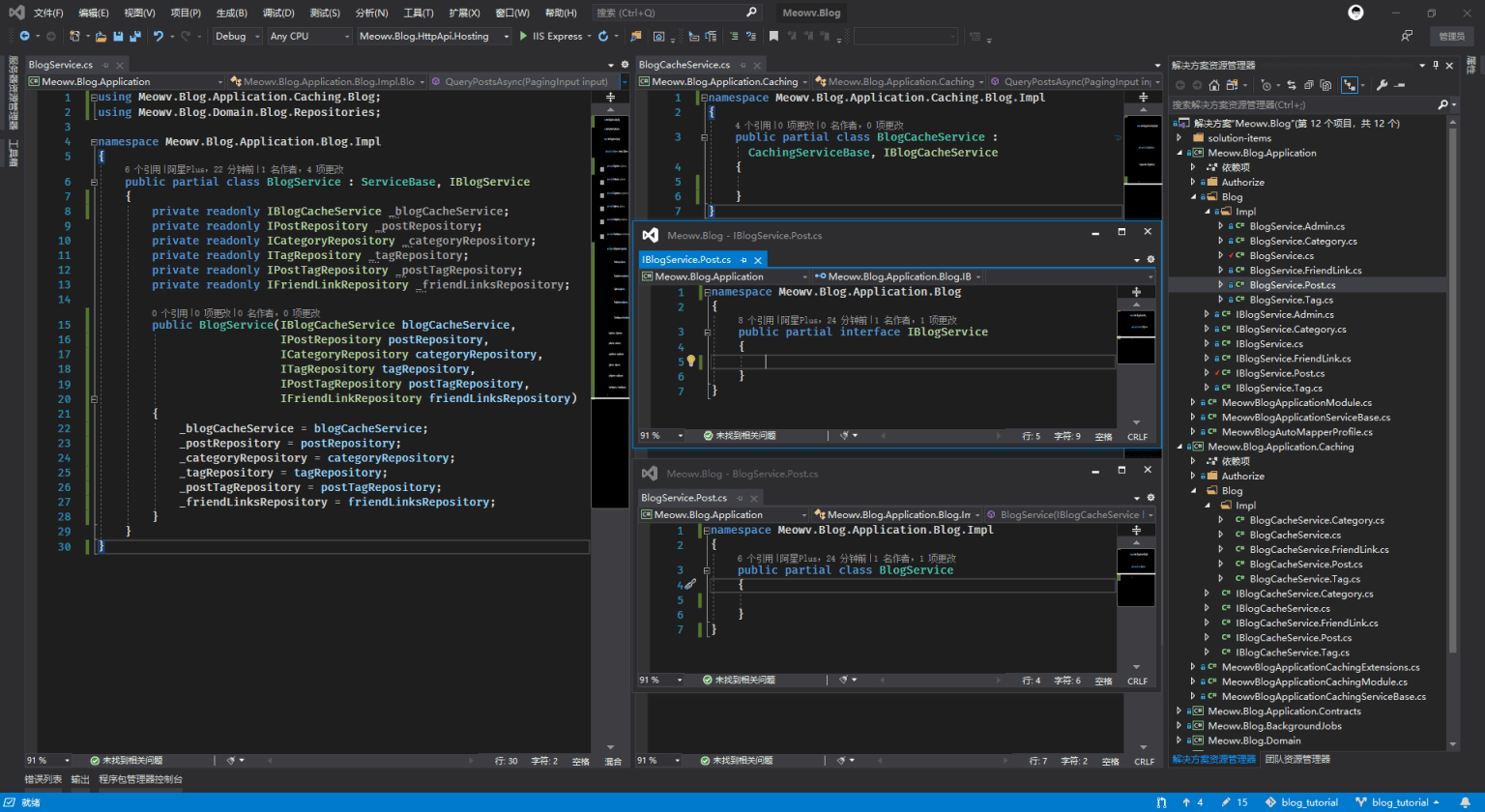 注意都需要添加 partial 修饰为局部的接口和实现类,所有文章相关的接口放在IBlogService.Post.cs中,分类放在IBlogService.Category.cs,标签放在IBlogService.Tag.cs,友链放在IBlogService.FriendLink.cs,后台增删改所有接口放在IBlogService.Admin.cs,最终效果图如下: