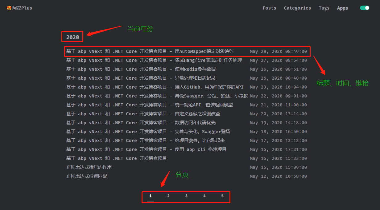 PageByIndex(...)、TryToDateTime()是.ToolKits层添加的扩展方法,先查询总数,然后根据时间倒序,分页,筛选出所需字段,根据年份分组,输出,结束。