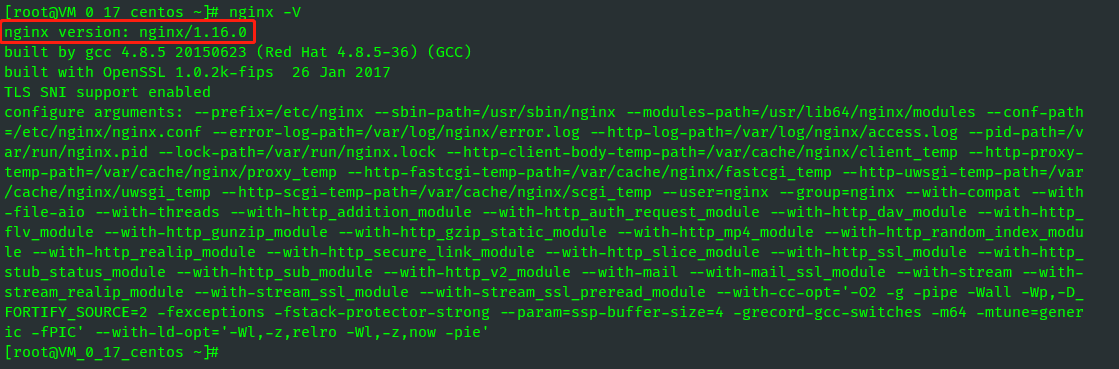 安装完成后可以使用 nginx -V 查看安装版本等信息。
