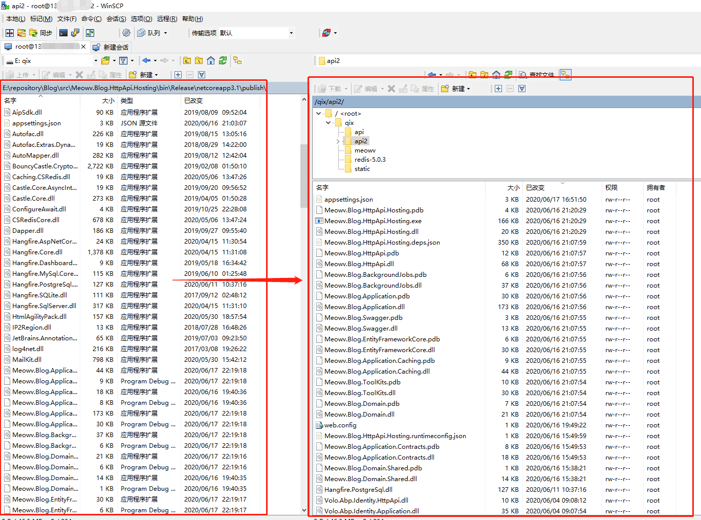 利用 WinSCP 工具将发布好的代码上传至服务器,我这里新建了文件夹 qix/api2 方便自己管理,顺便提一句,WinSCP 是一个 Windows 环境下使用的 SSH 的开源图形化 SFTP 客户端。