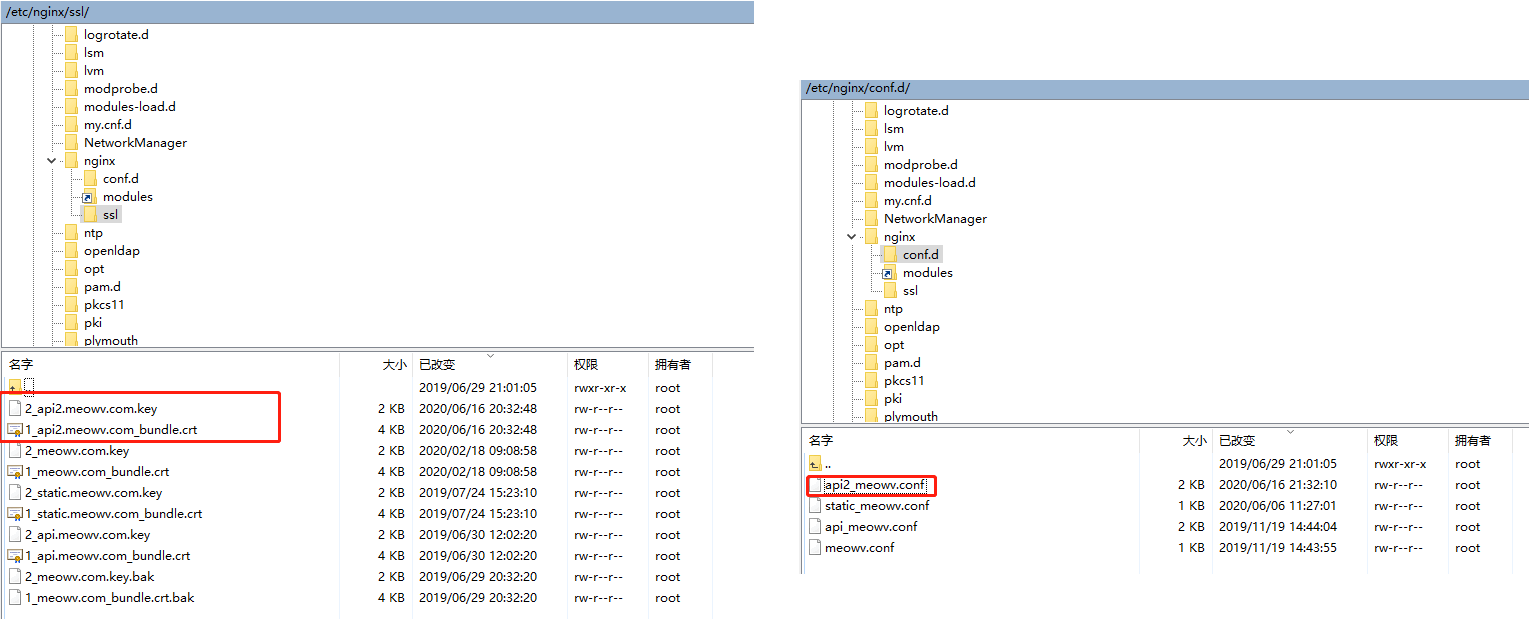这时可以去配置 Nginx 方向代理了。来到 nginx 安装目录,我这里是 /etc/nginx ,新建一个文件夹 ssl ,将申请的 SSL 证书放进去,然后再 conf.d 文件夹下新建一个 api2_meowv.conf 文件,写入下面的配置信息。