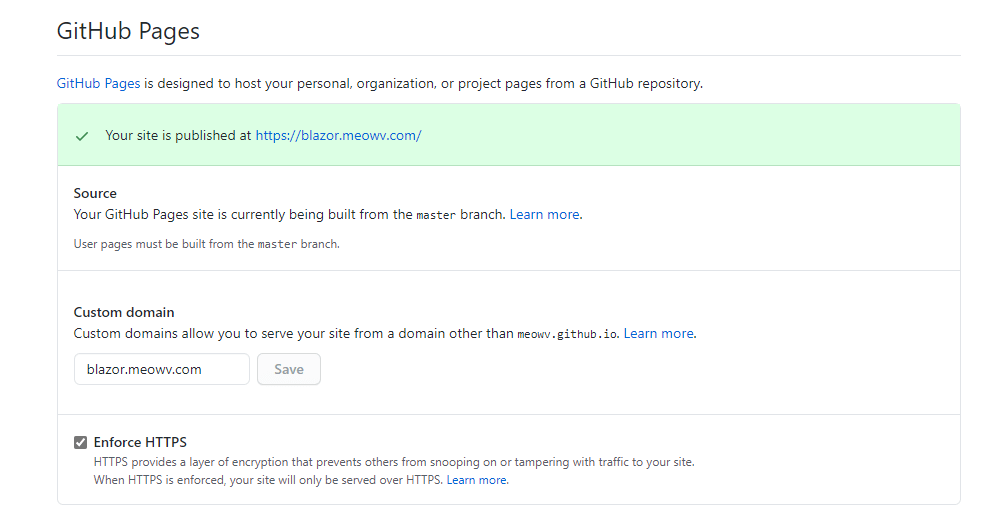 我这里自定义了一个域名,如果你也想自定义域名可以在根目录添加一个名为CNAME的文件,里面的内容就是你的域名,我这里就是:blazor.meowv.com 。