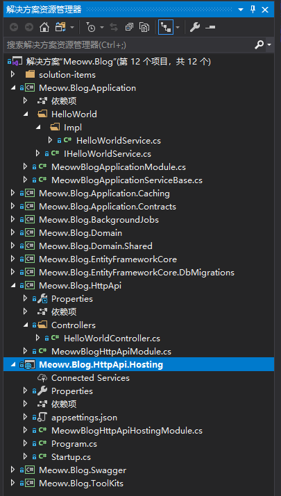 好了,完成以上步骤,基本上差不多了,在Meowv.Blog.HttpApi中新增一个 Controller,HelloWorldController.cs