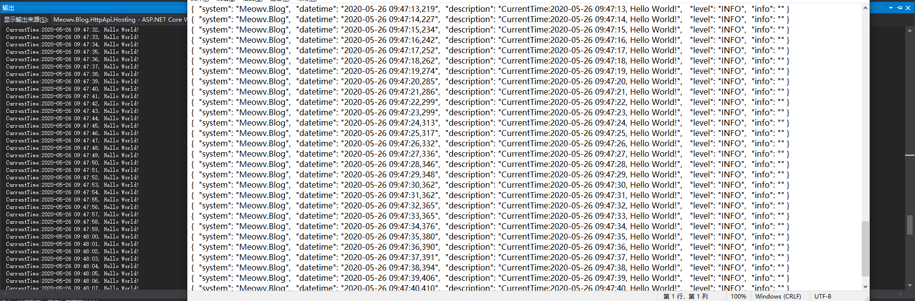 看一个例子,我们每过一秒输出一句 HelloWorld,并写入日志中。
