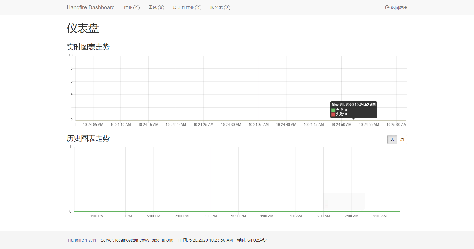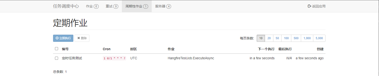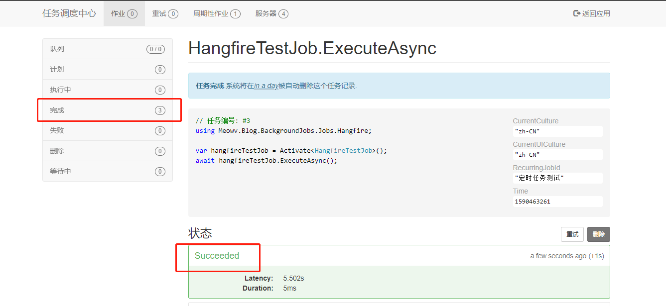 这样我们就集成好了 Hangfire,并且还有了一个可视化的界面,接下来我们同样实现一个简单的定时任务看看效果。