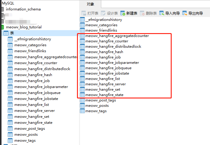 在new MySqlStorage()中配置连接字符串,new MySqlStorageOptions()中配置表前缀,Hangfire 会在第一次运行时,自动为我们创建表。