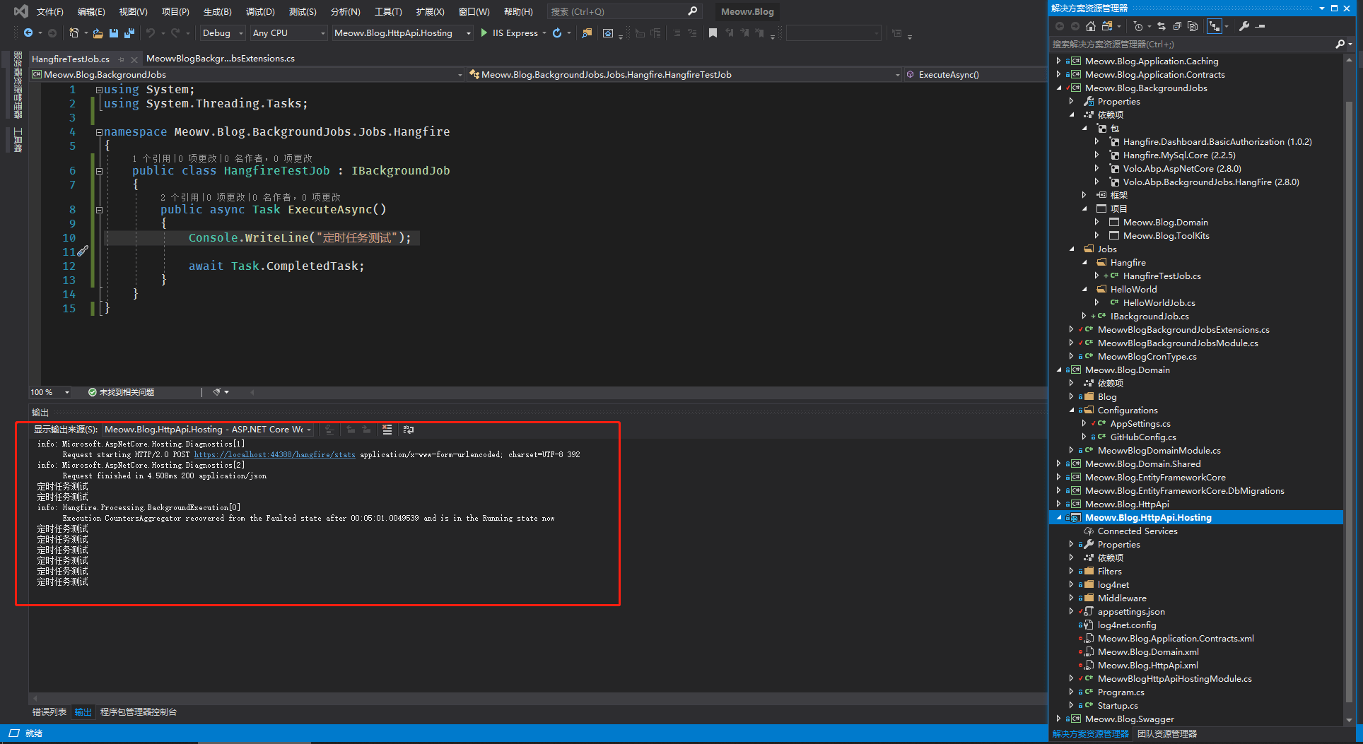 最后不要忘记,在.HttpApi.Hosting层模块类中依赖定时任务模块MeowvBlogBackgroundJobsModule。