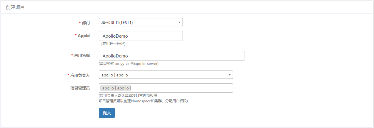 然后我们在Apollo管理界面新建一个与配置在appsettings.json中 AppId 同名的项目ApolloDemo。