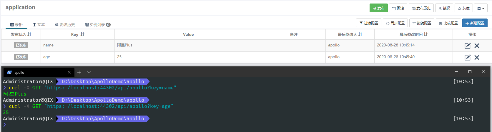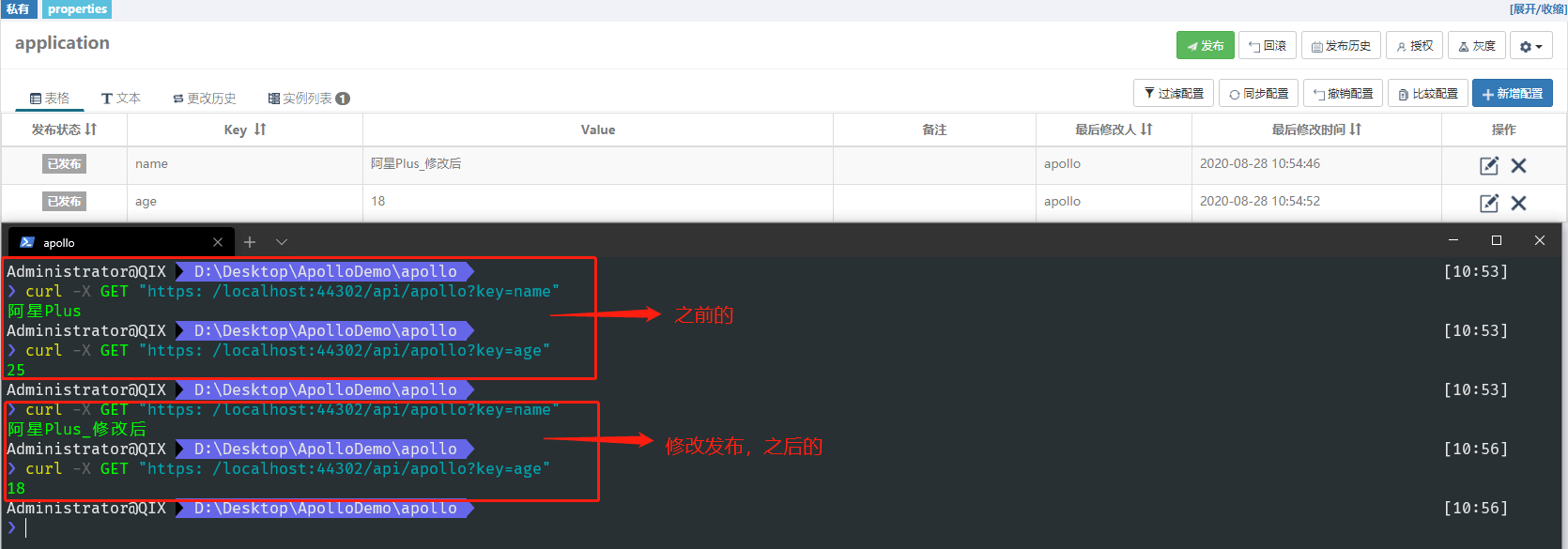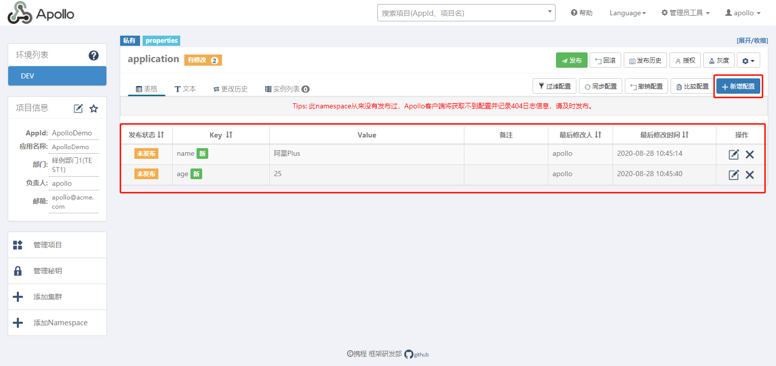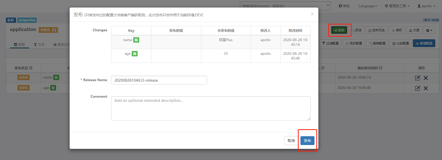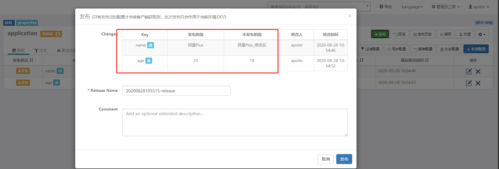 然后修改 name 和 age 的值,在调用接口看看。注意在Apollo中修改后,需要发布才会生效。