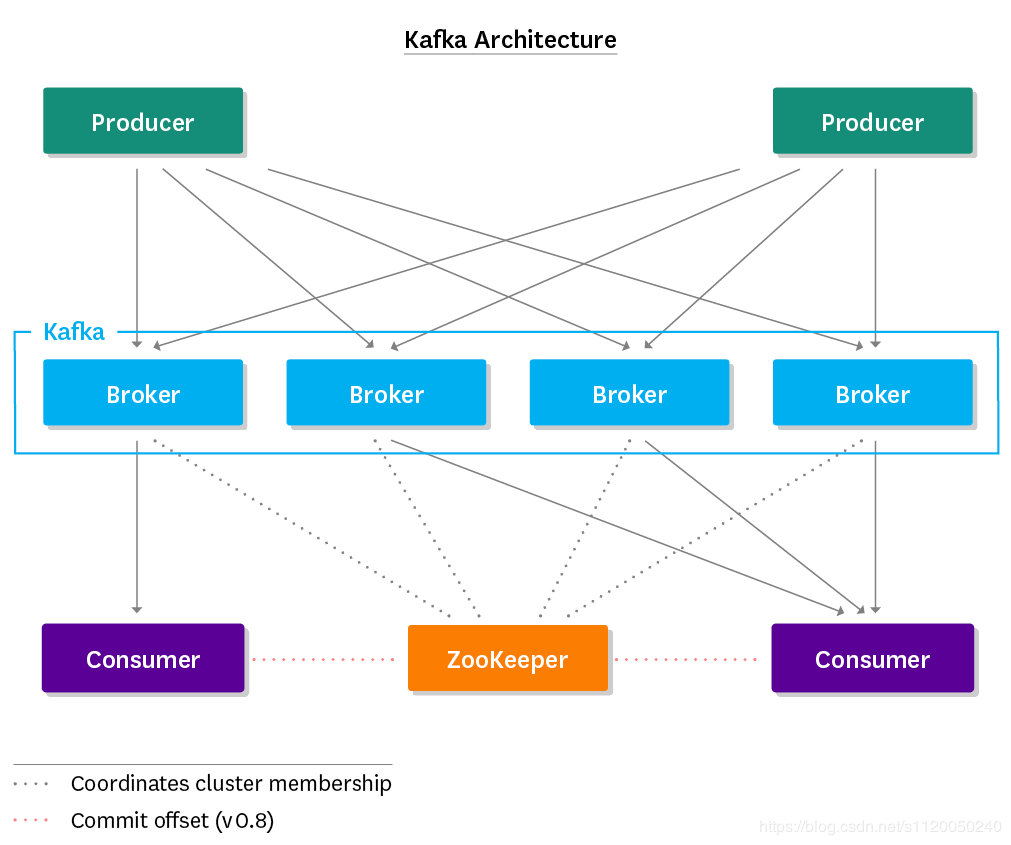 - Broker:消息中间件处理节点,一个 Kafka 节点就是一个 broker,多个 broker 可以组成一个 Kafka 集群。