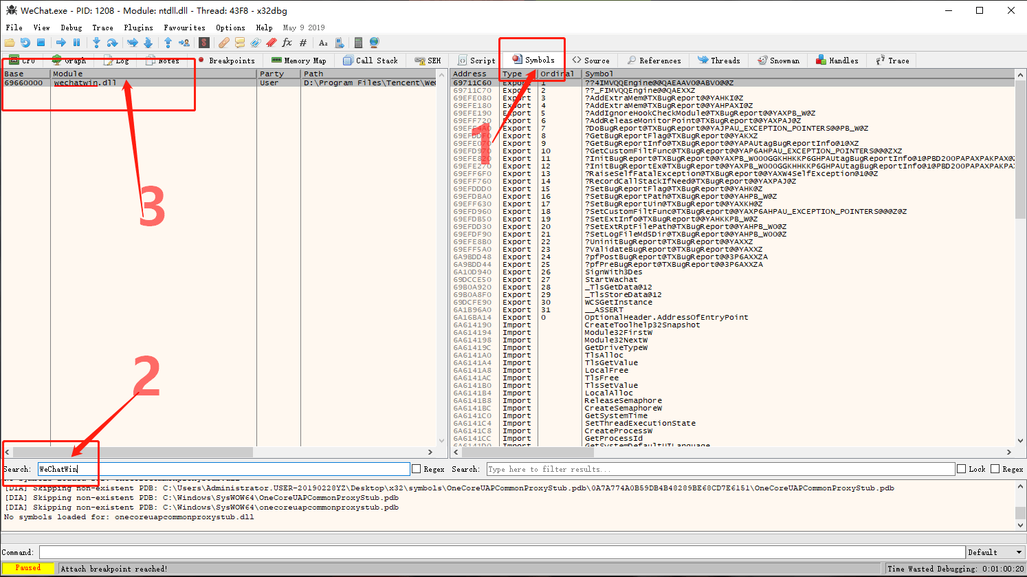 点击菜单栏下面 Symbols 按钮,搜索 “WeChatWin”,找到 WeChatWin.dll,双击进入