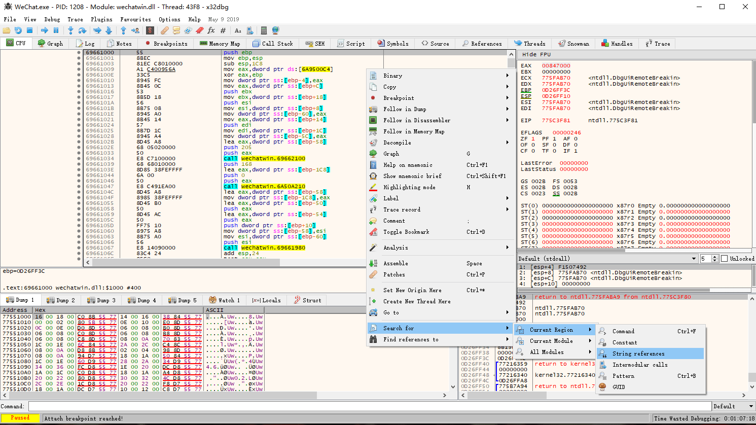 打开 x32dbg.exe,打开微信扫码登录,附加微信进程,此时微信处于假死状态,暂时不要使用。