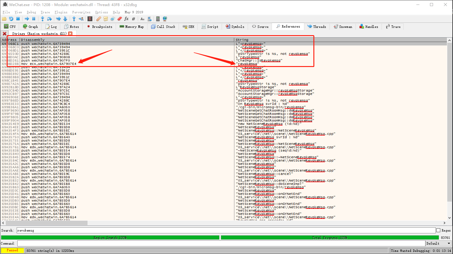 在当前界面右键,搜索,当前区域,字符串,输入 “revokemsg” 搜索,然后找到第一个字符串为 “revokemsg” 的命令双击进入跳转到二进制程序